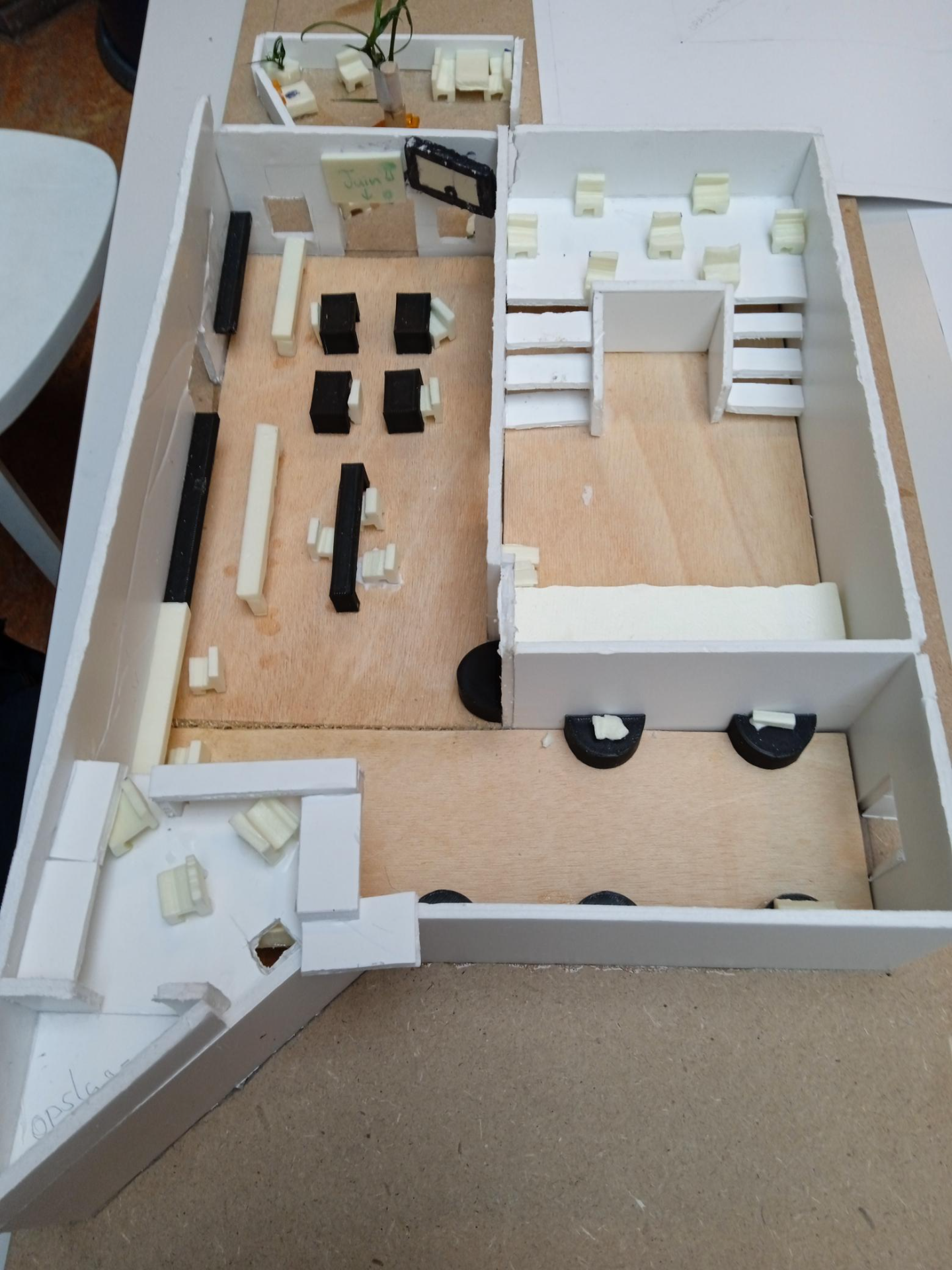 Dit is onze maquette. Wij hebben al onze ideeën hierin verwerkt. Wij hebben hier 4 weken aan gewerkt en hebben er veel moeite in gestopt. Speciale onderdelen van onze maquette zijn de eikenhouten vloer en de tafels die zijn gemaakt van een 3D-printer. Ook hebben we een theater gemaakt zodat de maquette en mooier en completer eruitziet.